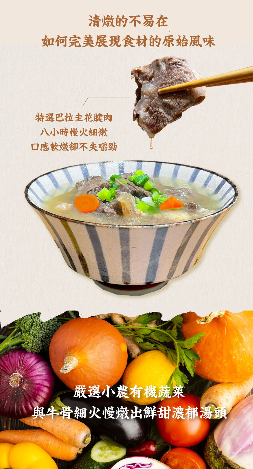 ・有機小農蔬菜與牛骨熬製甘甜湯頭